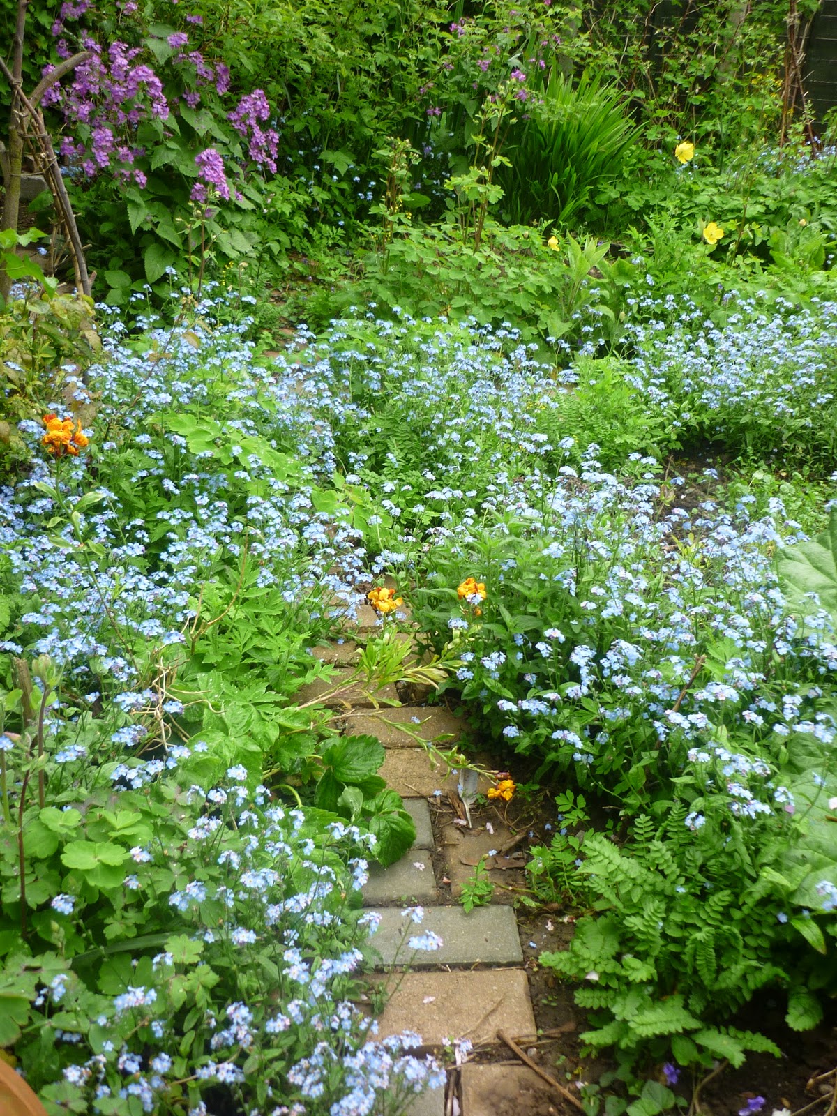 At the moment,the garden is divided into two colours - white around the lawn where the whitebells dominate the flower beds and the blue of forget me nots taking over the vegetable patch - but almost every inch has flower of some sort...